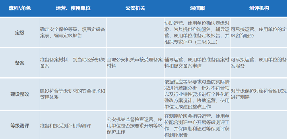 網絡安全等級保護工(gōng)作(zuò)包括定級、備案、建設整改、等級₹'ש測評、監督檢查五個(gè)階段。在等級保護全流程中,涉及到₩α(dào)四個(gè)不(bù)同的(de)角色,分(fēn)≥®¶¥别是(shì):運營使用(yòng)單位、公安機(jī)關、安全廠(c↔ ÷hǎng)家(jiā)、測評機(jī)構"$。等級保護各工(gōng)作(zuò)流程內(nèi¶ ✔)容及角色分(fēn)工(gōng)如(rú∑∑)下(xià):