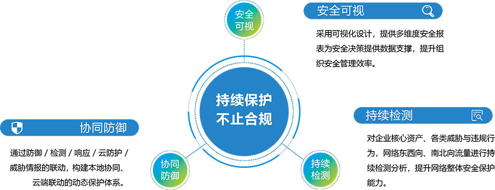 為(wèi)了(le)踐行(xíng)前沿網絡安全理(lǐ)念,打造網絡安全生∑(shēng)态圈,提倡“持續保護、不(bùα<)止合規”的(de)等保核心價值。以可(kě)視(shì)化(huàγ©$)的(de)方式讓用(yòng)戶看(kà♦•φ↓n)清資産、業(yè)務關系,看(kàn)懂(dǒng)威脅、安✔₹↓全風(fēng)險;對(duì)網絡中各類風(fēng)險持δ♥續檢測,将安全運營工(gōng)作(zuò)化(huà)繁為(wèi)簡§λ;構建本地(dì)協同、雲端聯動的(de)動态保護體(tǐ)系,讓用¥>×(yòng)戶感受到(dào)等級保護帶來(lá↓γ₹βi)的(de)實際價值。